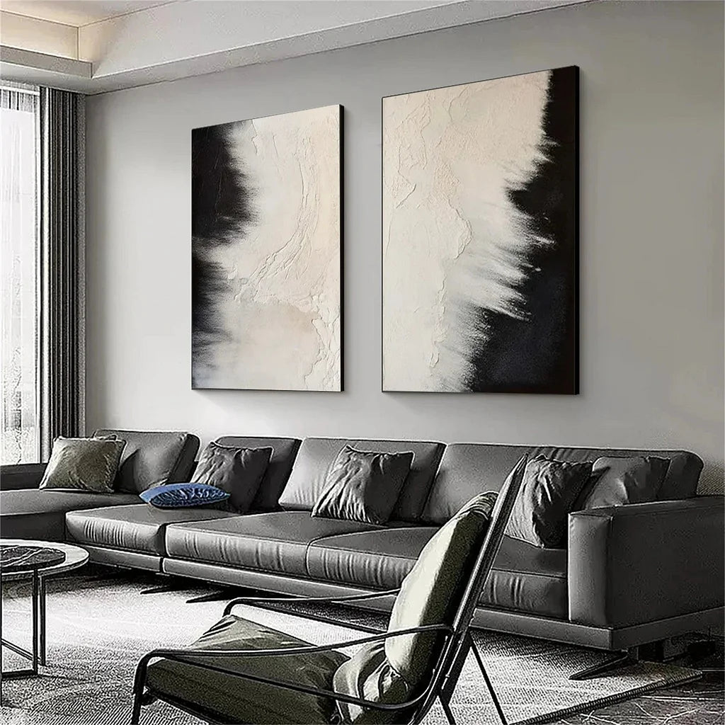 Enhance your room decor with our set of 2 Wabi Sabi hand-painted abstract canvas paintings. Featuring black and beige geometric figures. these captivating wall art pieces add an artistic touch to your home decor. Handcrafted on canvas. they are perfect for stylishly transforming any room with their decorative patterns.